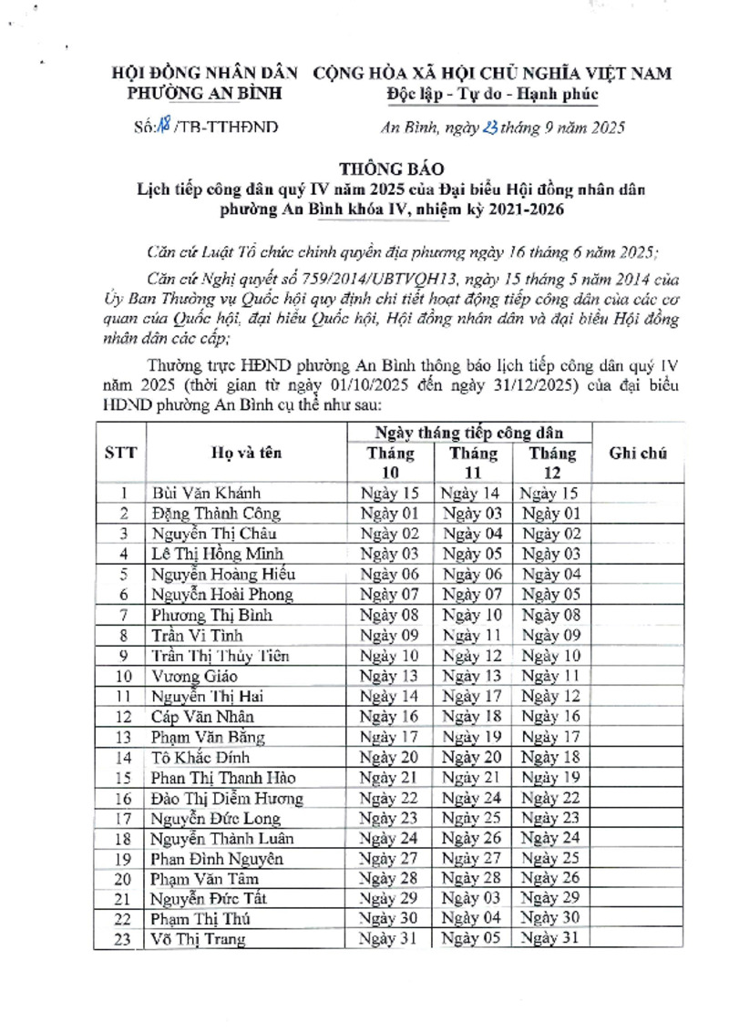 | Tiêu đề văn bản | Lịch tiếp công dân quý IV năm 2025 của Đại biểu HĐND phường An Bình | ||