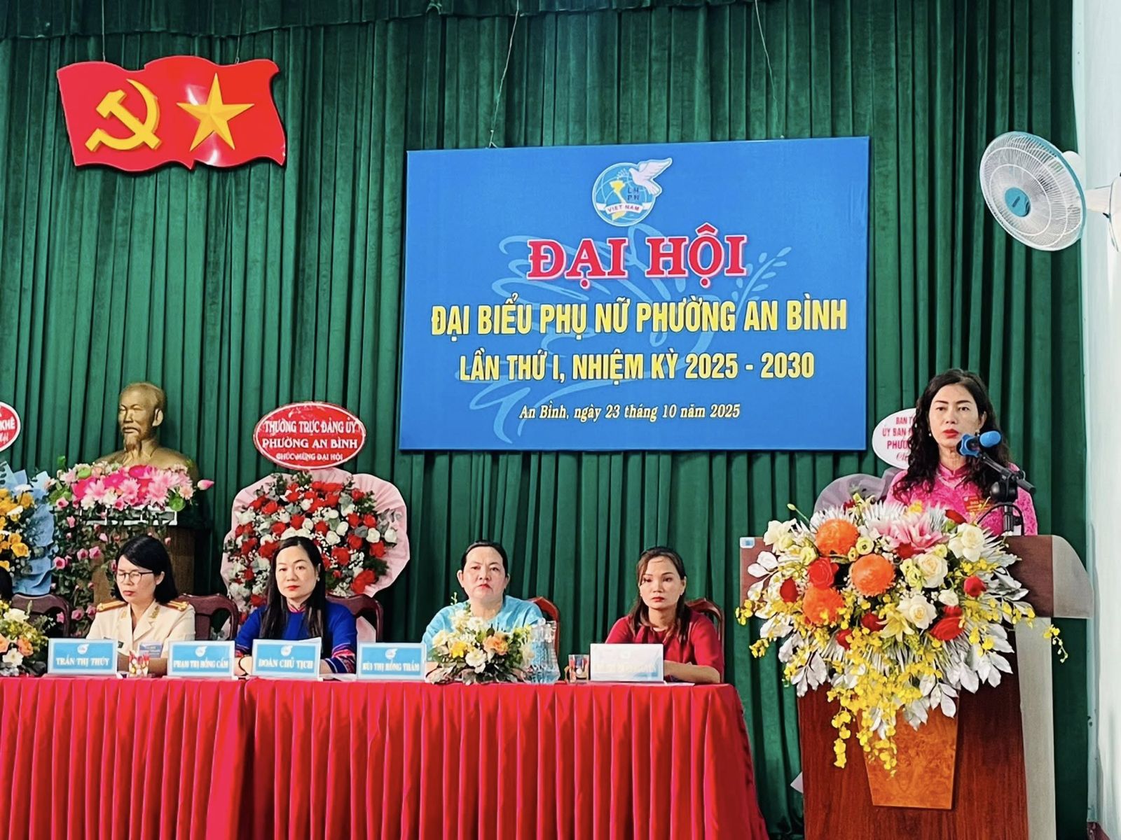 Đại hội đã tập trung thảo luận và đánh giá toàn diện việc thực hiện Nghị quyết Đại hội đại biểu phụ nữ phường giai đoạn 2021 – 2025. Báo cáo Chính trị đã biểu dương tinh thần đoàn kết, sáng tạo, vượt khó của các tầng lớp phụ nữ An Bình, những người đã góp phần quan trọng trong phát triển kinh tế, giữ gìn văn hóa và xây dựng tổ ấm gia đình. Trong nhiệm kỳ qua, dù đối diện với những khó khăn như ảnh hưởng của đại dịch COVID-19 và biến động giá nông sản, Hội đã đạt được những kết quả ấn tượng: phát triển mới 1.289 hội viên, nâng tổng số hội viên lên 7.410 người (đạt 84% phụ nữ từ 18 tuổi trở lên); hỗ trợ 21 hộ hội viên, phụ nữ nghèo thoát nghèo đa chiều; và tích cực tham gia các chương trình an sinh xã hội như Chương trình "Mẹ đỡ đầu" với việc nhận đỡ đầu 12 trẻ mồ côi nghèo, vận động nguồn lực hỗ trợ trị giá gần 700 triệu đồng. Các cuộc vận động trọng tâm cũng được triển khai hiệu quả, điển hình là việc vận động, hỗ trợ 550 hộ gia đình đạt “5 không, 3 sạch”, “5 có, 3 sạch”, góp phần xây dựng cảnh quan xanh – sạch – đẹp và làm đường giao thông nông thôn.